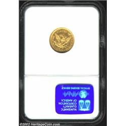 1858-C $2 1/2 MS61 NGC. Winter 18-J. Last offered in our 2000 FUN Sale, with the description: "The 1858-C Quarter Eagle, one of just 9,056 pieces struck, is actually the most available issue of the denomination produced at the Charlotte facility during the decade and, according to Doug Winter, in high grade rarity it ranks 18th out of the 20 C-mint Quarter Eagles. The surfaces are lustrous and reddish-gold in hue. Reasonably well struck on the obverse, there is the usual C-mint softness in the center of the reverse. For pedigree purposes, a pair of small marks are noticed between stars 4 and 5...." Population: 3 in 61, 7 finer (10/02). Ex: 2000 FUN Sale (HNAI, 1/00), lot 7623, where it was purchased for $4,830. From the Ashland City Collection. Important notice: We expect to be auctioning lots at the rate of 200-250 per hour. Sometimes eBay Premier live bid software cannot keep up with that pace, so we strongly recommend that you place a realistic proxy bid now as insurance to avoid disappointment. Also please note that all Heritage/CAA lots purchased through eBay Premier carry a 20% Buyer's Premium. Please make sure you read the Terms and Conditions.