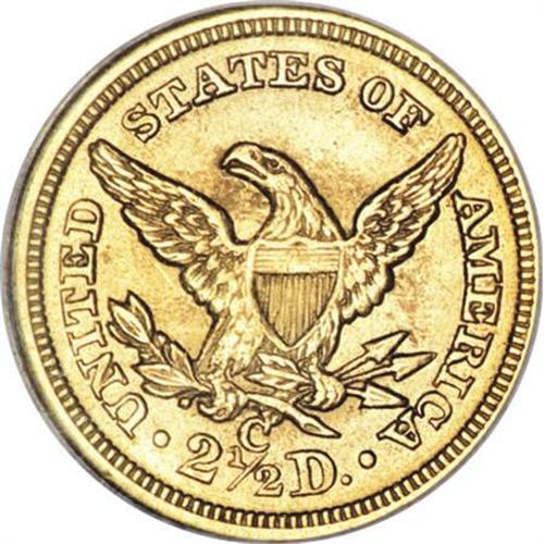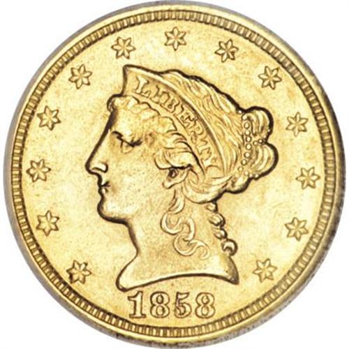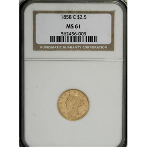 <B>1858-C $2 1/2 MS61 NGC.</B></I> Variety 18-J, the only known die pairing. The mintage of 9,000 coins represents all of the quarter eagles struck in Charlotte from year-end 1856 until 1860. This piece shows original, orange-gold, uncleaned surfaces with a bit of buildup in the protected areas, proclaiming both its originality and appeal. Sharply struck for the issue, with a few light, undistracting signs of contact. Census: 17 in 61, 13 finer (1/08).<BR><BR><B>Coin Engraver:</B> Christian Gobrecht<BR><BR><b>Shipping:</b> Coins & Currency (<a target="_blank" href="http://www.heritageauctions.com/common/shipping.php">view shipping information</a>)