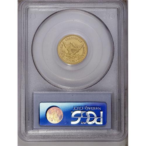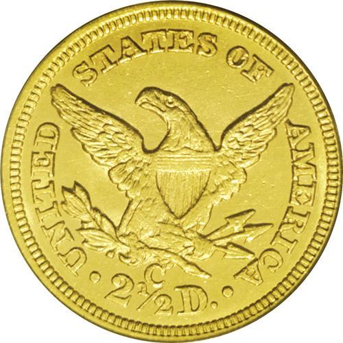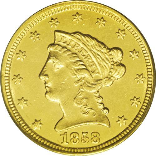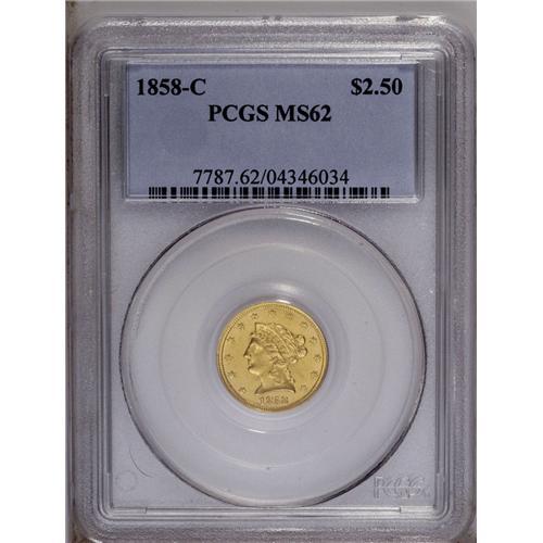 <B>1858-C $2 1/2 MS62 PCGS.</B></I> Variety 18-J. Charlotte Mint quarter eagles tend to provide greater value than half eagles from the same branch mint. For example, the 1858-C quarter eagle has a mintage of 9,056 pieces, while the half eagle of the same date and mint has a production more than four times greater. Nonetheless, the 2006 <I>Guide Book</B></I> lists higher prices in each grade for the half eagle. The present piece offers consistent straw-gold color, and no marks are remotely worthy of discussion. The strike is generally strong, with some softness noted on the eagle's lower half and shield. A couple of planchet flaws, of mint origin, bookend the eagle's neck. Rare in all grades, the 1858-C becomes an important opportunity in Mint State condition.