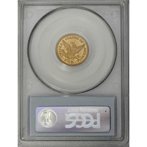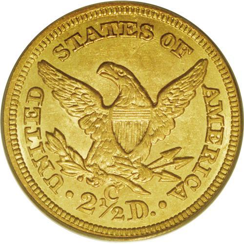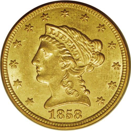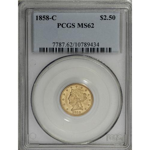 <B>1858-C $2 1/2 MS62 PCGS.</B></I> Variety 18-J. The only known variety for this issue. The Charlotte Mint coined 9,056 quarter eagles during the year, a production that was substantially larger than the previous few years. Today, the population of Mint State and higher quality circulated coins is likewise greater than for some of the previous issues. This Mint State piece is a wonderful example with highly lustrous and frosty yellow-gold surfaces with faint orange toning on the reverse. It is nicely detailed with strong obverse and reverse definition. Population: 13 in 62, 3 finer (1/07).<BR><BR><b>Shipping:</b> Coins & Currency (<a target="_blank" href="http://www.heritageauctions.com/common/shipping.php">view shipping information</a>)