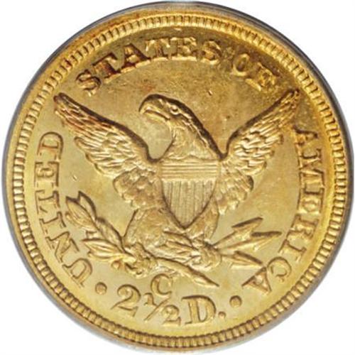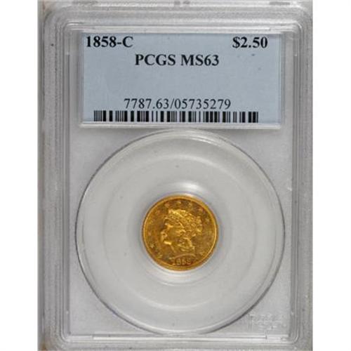 <B>1858-C $2 1/2 MS63 PCGS.</B></I> Variety 18-J. The shining surfaces of this yellow-orange quarter eagle display strong, slightly reflective luster. Sharply struck devices, an unusual feature for a Charlotte product, only add to the immense eye appeal of the piece. While the surfaces show none of the deep cuts that often plague the issue, light, scattered abrasions are present, and a small hollow in the left reverse field may serve as a pedigree marker.<BR> Winter (1997) acknowledges the overall availability of this issue: "The 1858-C is the most common Charlotte quarter eagle struck during the 1850s." After Charlotte struck no quarter eagles in 1857, the reaction was an oversupply in 1858, as that Mint did not produce that denomination in 1859 either. Despite its status as a "common" Charlotte gold issue, the 1858-C quarter eagle, like any other branch mint piece, becomes less and less available in finer grades, and a Select example such as the present piece is assured a place on the Condition Census. Population: 3 in 63, 0 finer (8/07).<BR><BR><B>Coin Engraver:</B> Christian Gobrecht<BR><BR><b>Shipping:</b> Coins & Currency (<a target="_blank" href="http://www.heritageauctions.com/common/shipping.php">view shipping information</a>)