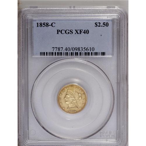 <B>1858-C<$2 1/2> XF40 PCGS.</B></I> Variety 18-J. This is the only die variety known, not surprising given the limited mintage of just 9,056 coins. Wispy slide marks are detected across the straw-gold and honey surfaces. Sharper than an average strike, although the eagle's neck and leg are incompletely defined.