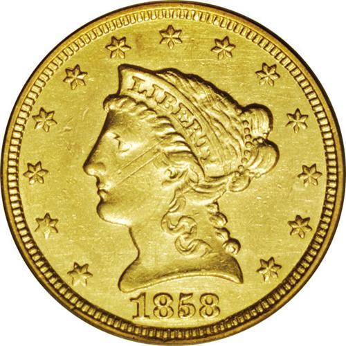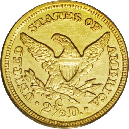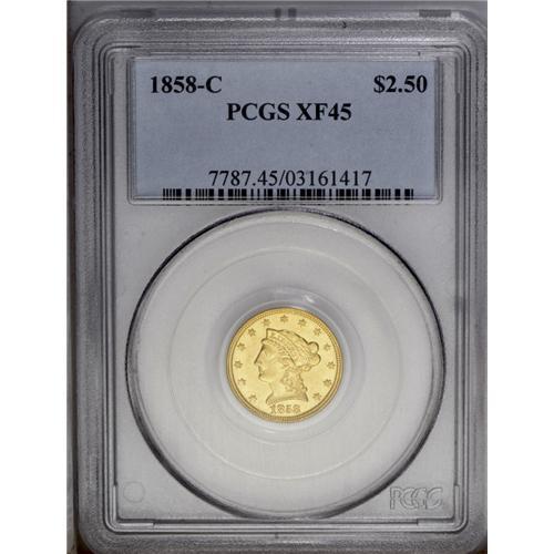 <B>1858-C $2 1/2 XF45 PCGS.</B></I> Variety 18-J, the only known dies. The 1858-C was minted to the extent of a paltry 9,056 pieces, yet it is the most available Charlotte issue of the denomination from this decade. Bright yellow-gold surfaces display nicely defined devices, though the eagle's right leg feathers are characteristically soft. We recommend personal examination of this coin by prospective bidders, as two prominent linear marks, which are possibly post-strike, extend diagonally across Liberty's cheek into the hair.<BR><I>From The Carolina Gold Collection, Part Two.</B></I>