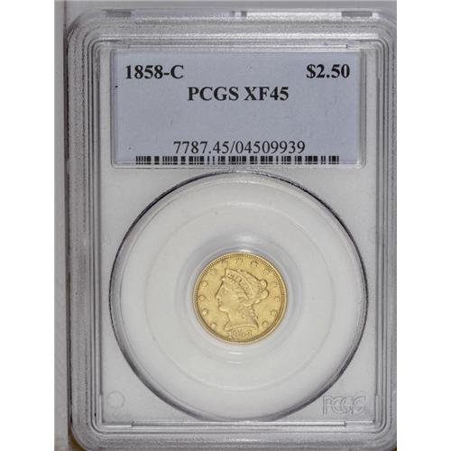 <B>1858-C<$2 1/2> XF45 PCGS.</B></I> Variety 18-J. An attractive, evenly worn example with remarkably unabraded surfaces and pleasing khaki-green coloration. Slight incompleteness of strike over the eagle's neck and left (facing) leg feathers, and on the first two obverse stars, is noted for accuracy. One of just 9,056 pieces struck, with an estimated surviving population of 100-150 coins.<BR><I>From The Carolina Gold Collection, Part Three.</B></I>