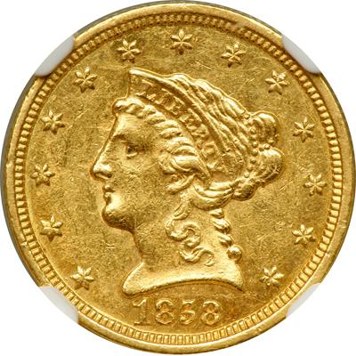 1858-C $2.50 Liberty. NGC graded MS-61. Only 9,056 minted. Part of a duet of 1858-C Liberty quarter eagles consigned to us. This Charlotte release is the most prominent C-mint quarter eagle produced in the 1850s, and in fact the most readily available C-mint of any decade after the 1839-C, 1843-C Large Date, 1847-C, and 1848-C. Although common in an absolute sense fails to cover the grade class of Mint State, since the Charlotte Mint recorded an original delivery of just 9,056 pieces in 1858. The preservation makes this example rarer still. Prior to the consignment of this coin, we had handled only on occasional '58-C quarter eagle in Mint condition, all of which qualify for Condition Census standing: Pop 17; 13 in 62; 2 in 63. In a new NGC 4 pronged holder (PCGS # 7787).