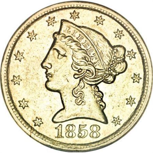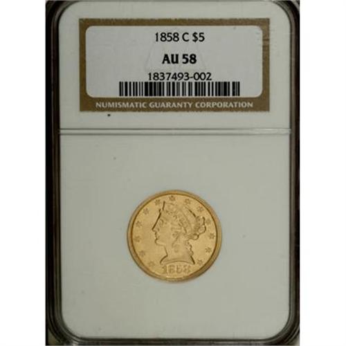 <B>1858-C $5 AU58 NGC.</B></I> Variety 26-K. This issue is favored by type collectors, but Mint State examples are very dear, and just 30 pieces have received an Uncirculated grade designation from NGC and PCGS combined. That makes AU an attractive and more affordable grade level for the average collector. This piece is crisply struck with plenty of satin luster and even khaki coloration. There are few marks on either side, and highpoint wear is minimal. <BR><BR><B>Coin Engraver:</B> Christian Gobrecht<BR><BR><b>Shipping:</b> Coins & Currency (<a target="_blank" href="http://www.heritageauctions.com/common/shipping.php">view shipping information</a>)