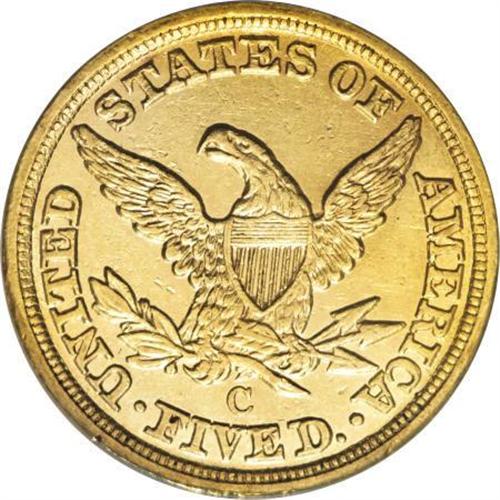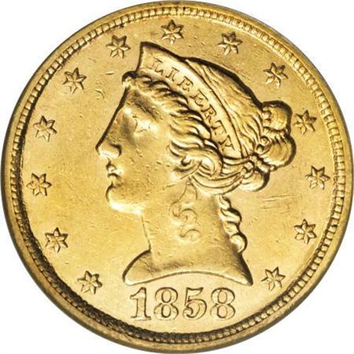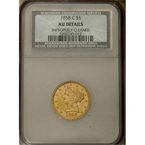 <B>1858-C $5 --Improperly Cleaned--NCS. AU Details.</B></I> Variety 26-K. Lightly cleaned on the obverse and reverse but a sharp and lustrous AU55 to AU58 coin. Of special note is a fairly large mark in the right obverse field below Liberty's hair bun. The surfaces are bright orange-gold, and the striking details are uncommonly bold for a Charlotte product. <BR><I>From The Carolina Circle Collection.</B></I><BR><BR><B>Coin Engraver:</B> Christian Gobrecht<BR><BR><b>Shipping:</b> Coins & Currency (<a target="_blank" href="http://www.heritageauctions.com/common/shipping.php">view shipping information</a>)
