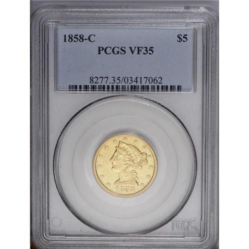 <B>1858-C $5 VF35 PCGS.</B></I> Variety 26-K. A straw-gold No Motto Five with somewhat bright surfaces and a decent strike for the Charlotte branch mint. A couple of roundish marks are concealed in Liberty's hair and above her shoulder.<BR><I>From The Carolina Gold Collection, Part Two.</B></I>