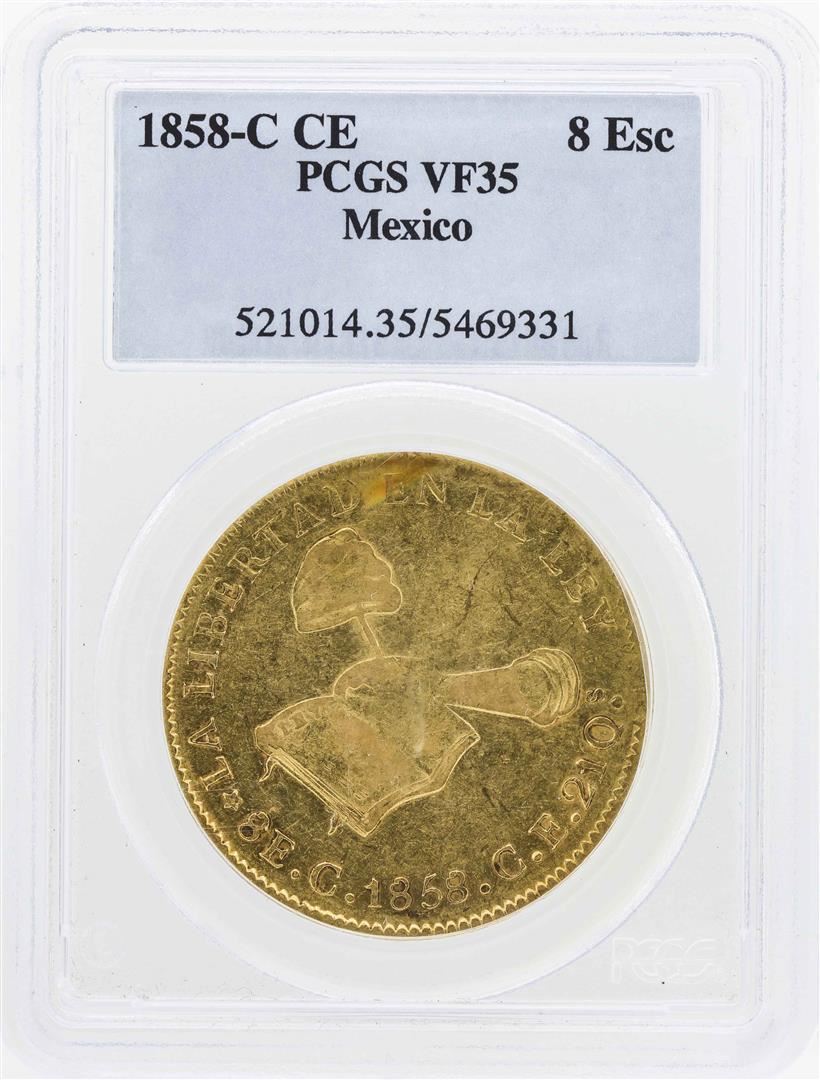 One 1858-C CE Mexico 8 Escudos Gold Coin PCGS VF35. PCGS Graded.