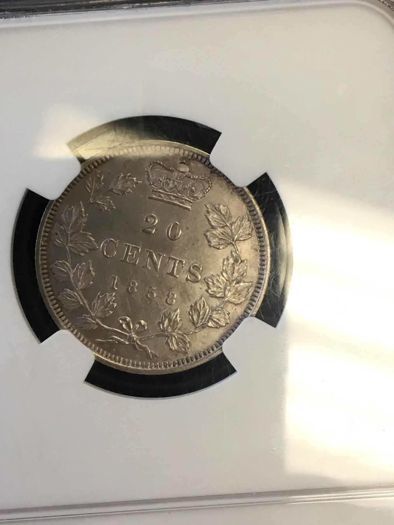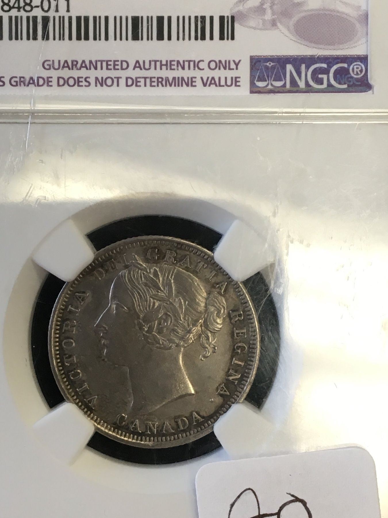NICE GRADE CANADA 20 CENT PIECE! RARE IN THIS GRADE.ITS NOT NOTED BUT WE FEEL THIS IS THE RE-ENGRAVED 5 VARIETY.HAIRLINE SCRATCHES