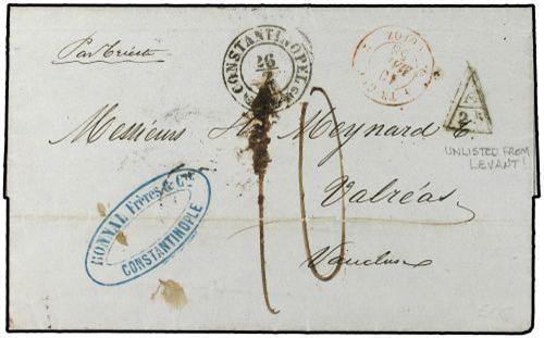 1858 Cover from Constantinople via Trieste to France sent stampless from Austrian PO, struck with triangular ´F/25´ Accountancy handstamp in black. Lyon arrival (March 10) on reverse of scarce cover.