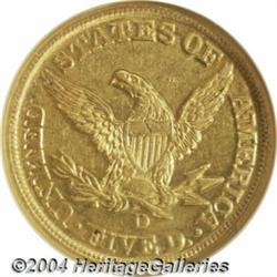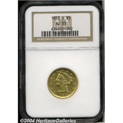 <B>1858-D<$5> AU53 NGC.</B></I> Variety 35-CC. Nicely struck, although the upper right hair curls and the fletchings have not received a full blow from the dies. Light wear is observed on the nostrils and forehead of Liberty, in addition to the wingtips. The eagle's neck and the horizontal shield lines have a couple of minor marks, while the fields and portrait are clean. Just 15,362 pieces were struck, and survivors are very scarce in finer circulated grades. Population: 6 in 53, 44 finer (6/04). <BR><BR><B>Important notice:</B> Heritage usually auctions material at the rate of 200-250 lots per hour. On some occasions eBay Live bid software or the Internet may not be able to keep up with the pace of the auction. We recommend placing a realistic absentee bid now as insurance to avoid disappointment. Occasionally the auctioneer may eliminate or reject an eBay Live bid, and the auctioneer may also reopen a lot after the close of the eBay live bidding (usually because we missed an audience bid), and may reject your bid even if it shows you as the winning bidder. By bidding via eBay Live, you agree that Heritage may award the lot to another bidder at its sole discretion under the circumstances described above or any other reasonable circumstances. Since eBay bids are not shown to us until we open the lot on the floor, we treat those bids just like floor bids. In most cases the floor responds before the eBay bid is presented to us, due to Internet lag time, so for consistency we have made it a policy that floor bids are always considered first over tie eBay live bids. Also please note that all Heritage lots purchased through eBay Live carry a 20% Buyer's Premium. Please make sure you read the Terms and Conditions before you bid. </span></font></tr></table></td></tr></table>