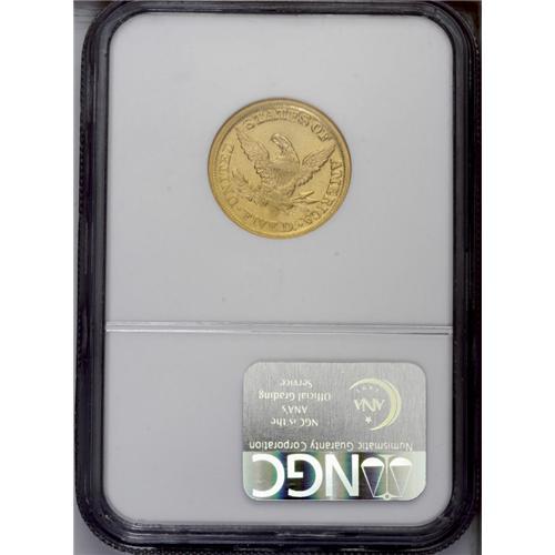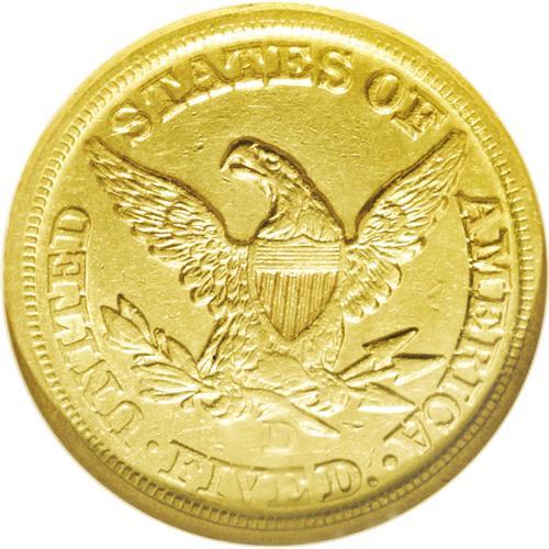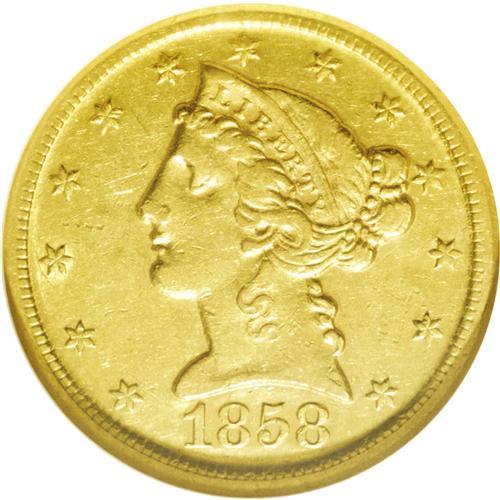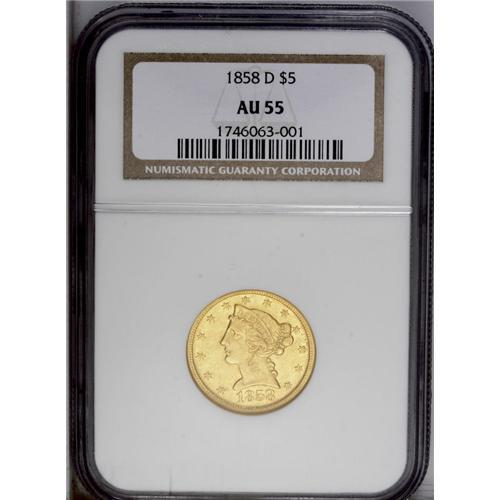 <B>1858-D<$5> AU55 NGC.</B></I> Variety 35-CC. The honey-gold surfaces of this Choice About Uncirculated coin have a few handling marks, unsurprising for a briefly circulated example. Some of the original luster remains intact near the well struck devices. Census: 17 in 55, 36 finer (7/06).<BR><I>From The Wyoming Collection.</B></I>