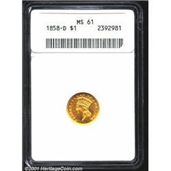 1858-D G$1 MS61 ANACS.<p>A fine representative of this low mintage D-mint Gold Dollar, the surfaces display pleasing orange-gold color and modest brightness in the fields. The strike is a little uneven, yet generally sharp, with the only bluntness of detail evident in the centers and over the lower right reverse. The grade-defining distractions include a few small scrapes in the obverse field.From the John H. Crisp Collection. Important notice: We expect to be auctioning lots at the rate of 200-250 per hour. Sometimes eBay Premier live bid software cannot keep up with that pace, so we strongly recommend that you place a realistic proxy bid now as insurance to avoid disappointment. Also please note that all Heritage/CAA lots purchased through eBay Premier carry a 20% Buyer's Premium.