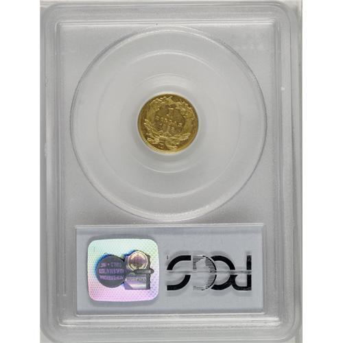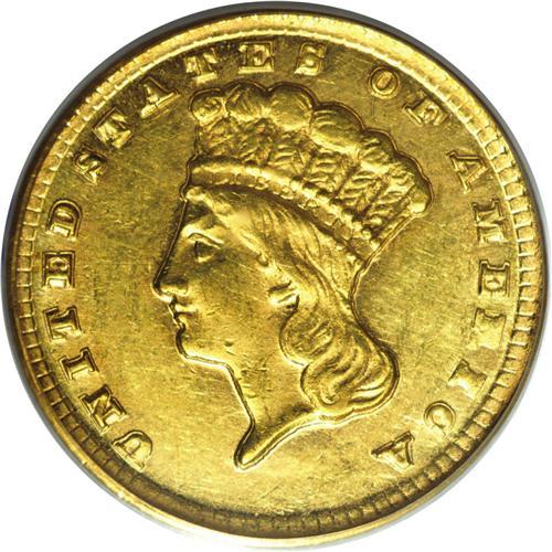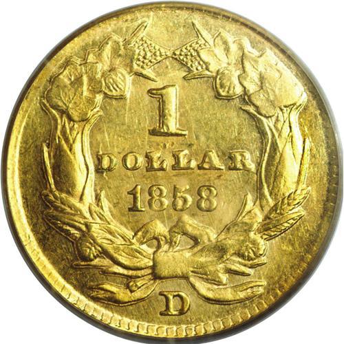 <B>1858-D<G$1> MS61 PCGS.</B></I> Variety 10-M, the only die pairing. One of the few Mint State survivors of this elusive Dahlonega gold dollar, a rare coin in all grades with an original mintage of only 3,477 pieces. As with all known examples of this issue, the central details are susceptible to areas of weakness, but in this case the bluntness is only minor. There is complete mint luster on both sides and the surfaces are essentially unabraded, showing just a few faint pinscratches in the obverse fields. Struck from slightly rotated dies. Population: 5 in 61, 15 finer (2/06).