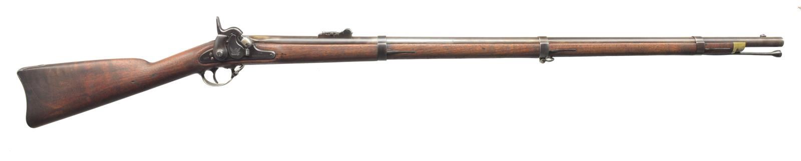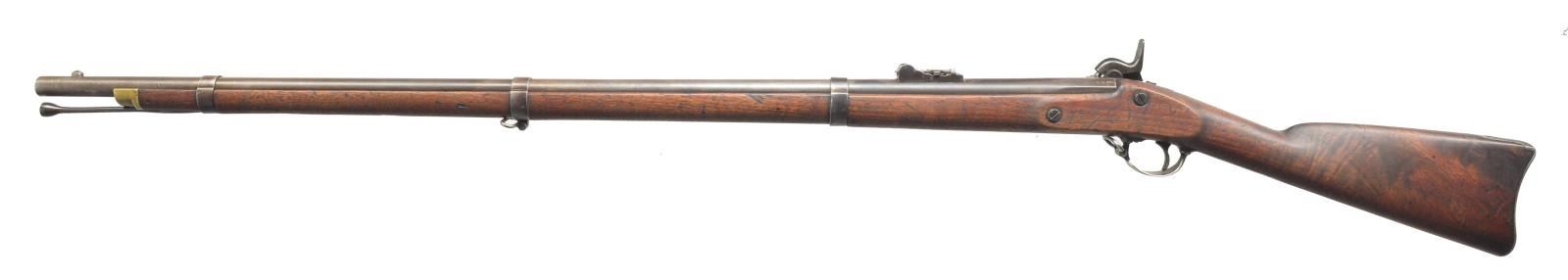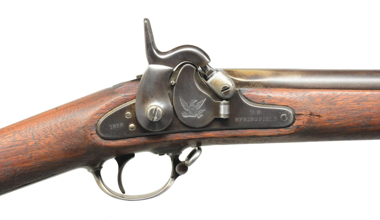 Cal. 58. NSN. Honest complete example, standard configuration, 40” bbl,. long range rear sight, 3 flat bands, swelled ramrod & brass nosecap. Lock has Maynard tape primer mechanism behind hinged door w/ eagle, “U.S. / SPRINGFIELD” forward of door, “1858” at tail. Bbl. has matching “1858” date on top flat & “VP” & eagle head proof. Stock has 2 inspector cartouches opposite lock, buttplate is surcharged “US”. CONDITION: good to very good overall, complete & original, metal is a mottled gray/brown patina, markings all discernible. Stock is well fit, sanded & refinished showing scattered scratches & handling marks, cartouches only discernible in outline, large sliver of wood broken out between lock & bbl .tang. Mechanically fine including Maynard device, well-defined rifled bore. (01-18523/JS). ANTIQUE. $1,100-1,400.