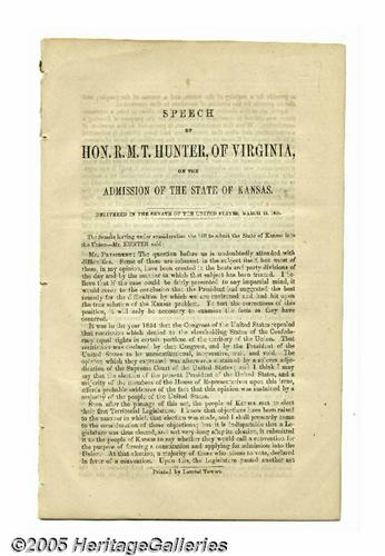 <B>1858 Debate on "Admission of the State of Kansas"</B></I> March 12, 1858, "Admission of the State of Kansas," a speech by Hon. R. M. T. Hunter of Virginia. Choice very fine. Sixteen page pamphlet, 9" x 5.75". This speech was delivered in the Senate of the United States. Senator Robert M. T. Hunter refers to John Bull: <I>"One drop of that venom may corrupt the blood which has flown through royal veins for centuries, and distemper the brain on whose proper balance the power and the peace of an empire may depend."</B></I> Hunter spoke in support of adopting Kansas into statehood under its pro-slavery Lecompton Constitution, adopted in 1857. Hunter believed that <I>"white men should have the continent, not as equals of the Indians or the negros, but as their masters."</B></I> Kansas was not admitted to the Union as a slave state. Kansas voters rejected the Lecompton Constitution in August 1858, and later in 1861 Kansas was admitted as a free state. A few pages are separated, otherwise, this piece is in great original condition. " Lot:251