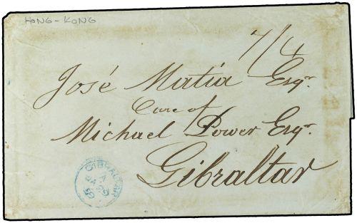 1858 (Dec 14) Outer letter sheet to Gibraltar with HONG KONG despatch cds in black on reverse. Quadruple rate of "7/4d". Charged in manuscript (four times 1/10d.) With Gibraltar arrival (Jan 29) in blue.