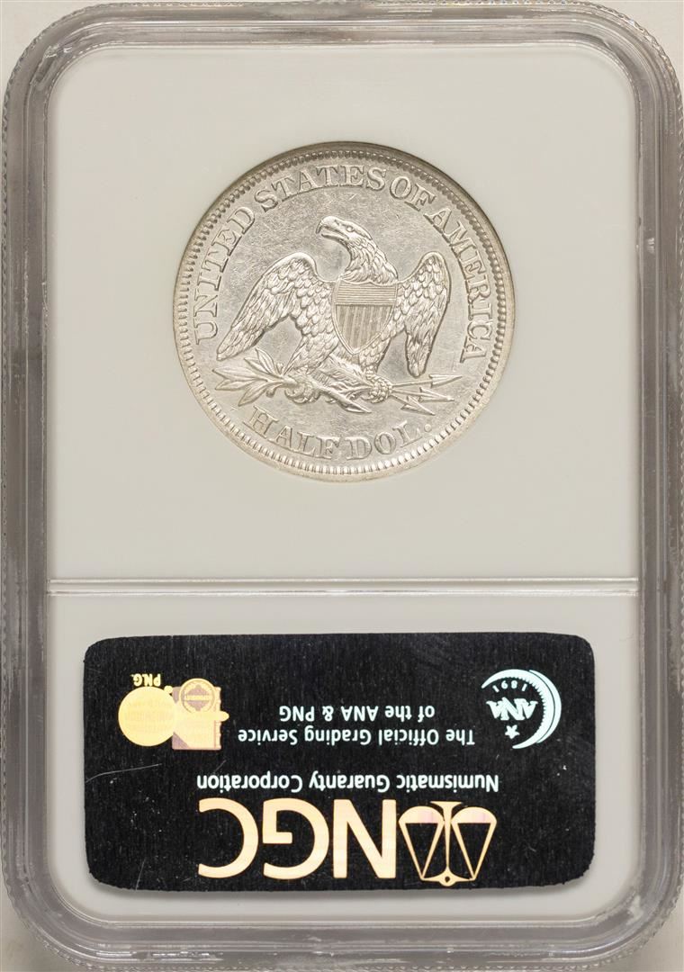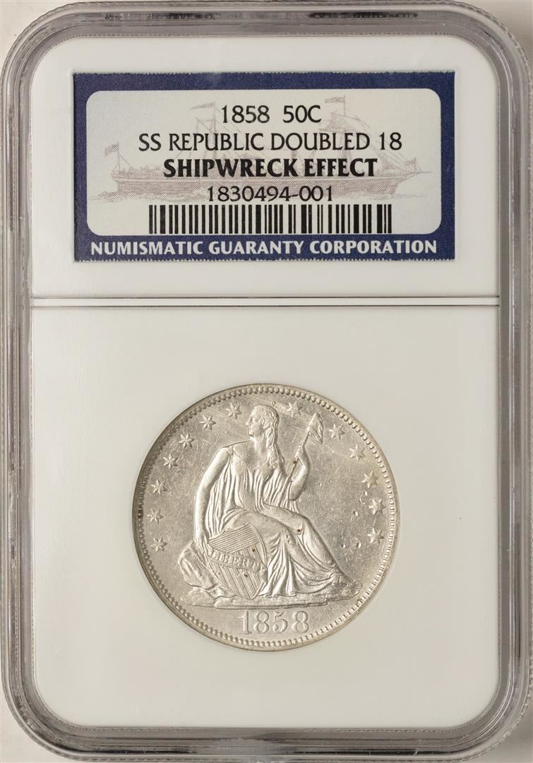 One 1858 Doubled 18 Seated Liberty Half Dollar Coin NGC Shipwreck Effect w/ Book. NGC Certified.