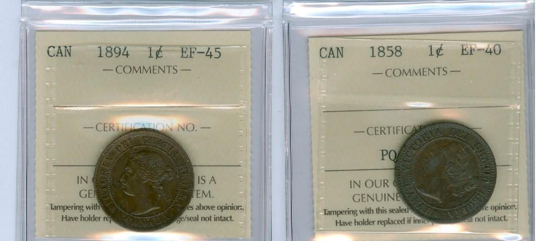 1858 EF40 & 1894 EF45 1¢. Lot of two coins both ICCS graded.