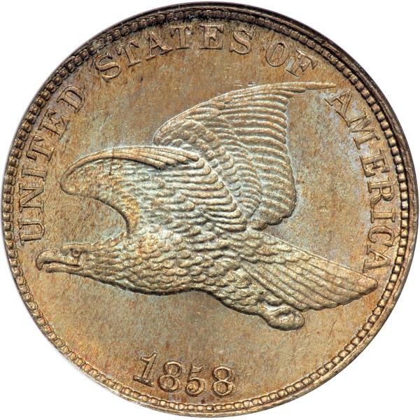 1858 Flying Eagle Cent. Large letters. NGC graded MS-66. Well struck with lovely toning on both sides. Pop 18; 2 finer .