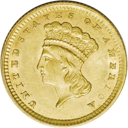 <B>1858<G$1> MS62 NGC.</B></I> The 1858 is quite elusive in the Mint State grades. NCS and PCGS have each certified about 100 Uncirculated pieces (9/05). Of course, many of these are undoubtedly resubmissions. The present specimen displays soft luster and peach-gold patina with light green and orange-gold accents, and sharply struck design elements. A few unobtrusive handling marks are visible over each side. Overall, a nice looking coin for the grade level. Population: 43 in 62, 27 finer (9/05). Envelope Included.