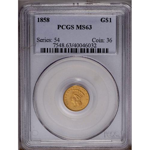 1858 G$1 MS63 PCGS. Intricately detailed with appealin 1858[G$1] MS63 PCGS.