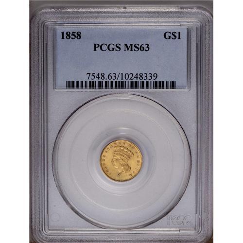 1858 G$1 MS63 PCGS. Well struck and satiny, with nice 1858[G$1] MS63 PCGS.