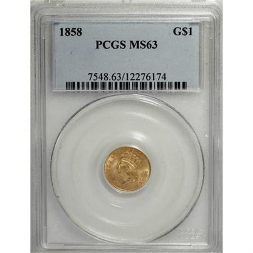 <B>1858 G$1 MS63 PCGS.</B></I> Buttery smooth and lustrous rose-gold surfaces are cleaner than one would expect in this grade, with just some minor hairlines to note. A lesser-seen Type Three issue at the Mint State level and infrequently found in finer grades. Population: 21 in 63, 27 finer (12/07).<BR><BR><B>Coin Engraver:</B> James B. Longacre<BR><BR><b>Shipping:</b> Coins & Currency (<a target="_blank" href="http://www.heritageauctions.com/common/shipping.php">view shipping information</a>)