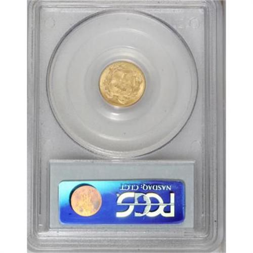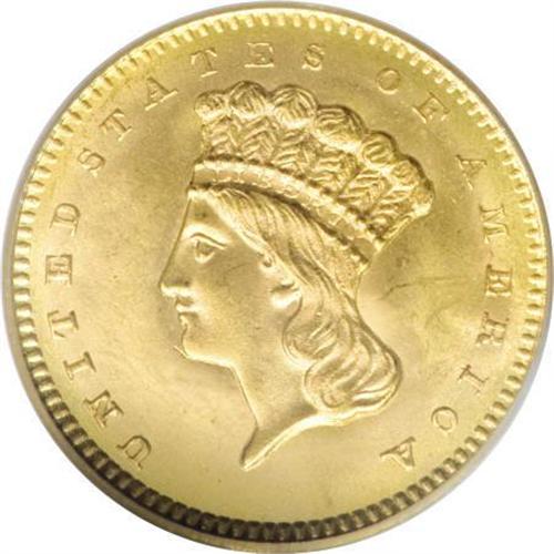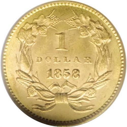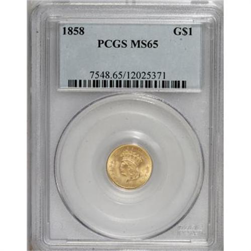 <B>1858 G$1 MS65 PCGS.</B></I> A stunning beauty that approaches the finest known for the date with only a few finer certified examples graded by NGC or PCGS. This Gem has frosty yellow luster with a hint of pink coloration. The surfaces are pristine, only marred by a few planchet striations on the reverse that occurred during the rolling and drawing process of the planchet strip during preparation for the coinage process. Population: 3 in 65, 7 finer (10/07).<BR><BR><B>Coin Engraver:</B> James B. Longacre<BR><BR><b>Shipping:</b> Coins & Currency (<a target="_blank" href="http://www.heritageauctions.com/common/shipping.php">view shipping information</a>)