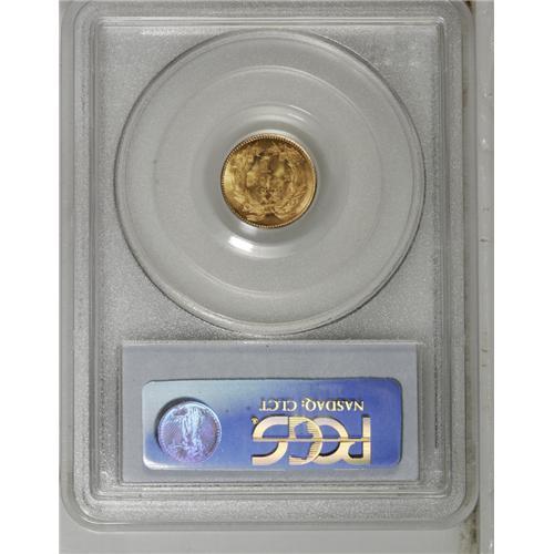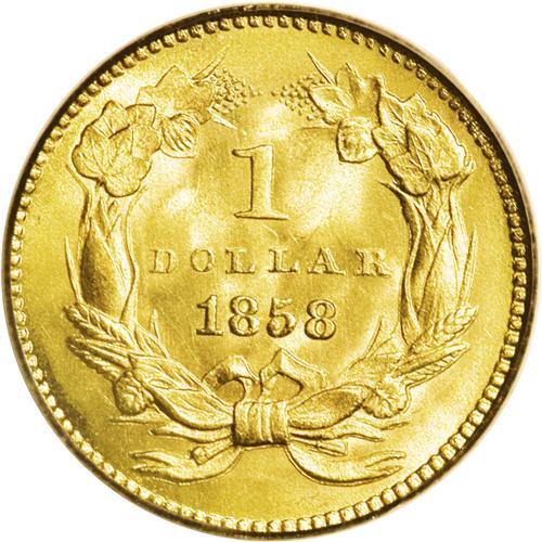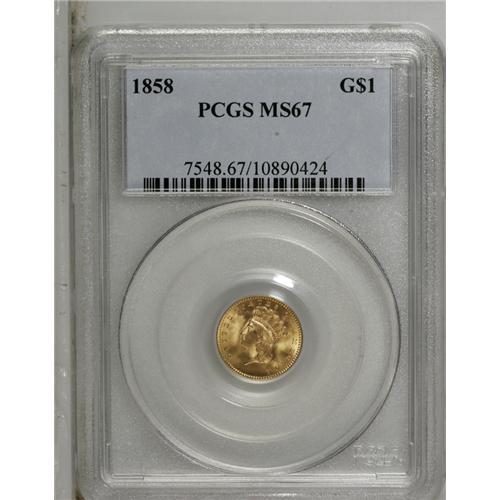 <B>1858 G$1 MS67 PCGS.</B></I> The 1858 gold dollar, with a mintage of nearly 118,000 pieces, is not rare in an absolute sense. Indeed, it is fairly available through MS62, but becomes scarcer in MS63 and near-Gem grades. Higher levels of preservation are considerably more difficult to acquire. In MS67, the grade of the coin in this lot, only 7 examples have been seen by PCGS and NGC combined, and a mere two specimens finer. Moreover, according to our records, only four MS67 examples have appeared for sale through the major auction houses within the last 15 or so years, as has one MS68 coin.<BR> On this example, fully lustrous surfaces display a softly frosted, nearly satiny texture, and are devoid of any mentionable marks. The strike is well executed, embolding the coin's motifs. Some minor clashmarks are noted on each side. A superb specimen for the aficionado of gold dollars.<BR><BR><b>Shipping:</b> Coin/Currency (<a target="_blank" href="http://www.heritageauctions.com/common/shipping.php">view shipping information</a>)