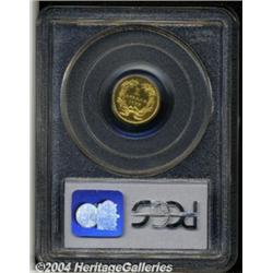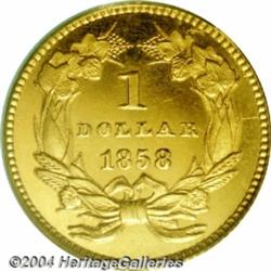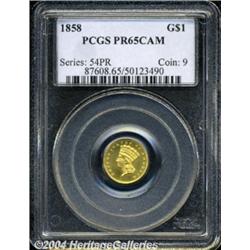 <B>1858<G$1> PR65 Cameo PCGS.</B></I> Like the 1857 above, the 1858 is another rare gold dollar in proof format. While 1858 marked the beginning of the modern era of proof coinage and lower denomination coins were struck in fairly large numbers, there were relatively few gold dollars produced. One researcher suggests that a list of survivors would number 10-12 pieces, including the ANS and Smithsonian coins.<BR> The surfaces of this piece display even golden-orange coloration. The devices show a significant amount of mint frost against the moderately reflective mirrors in the fields. Two identifying lint marks are located on the obverse: one below the first S in STATES and the other below the lowest feather in the headdress. A rare opportunity to acquire this important Type One gold dollar in proof format. <BR><BR><B>Important notice:</B> Heritage usually auctions material at the rate of 200-250 lots per hour. On some occasions eBay Live bid software or the Internet may not be able to keep up with the pace of the auction. We recommend placing a realistic absentee bid now as insurance to avoid disappointment. Occasionally the auctioneer may eliminate or reject an eBay Live bid, and the auctioneer may also reopen a lot after the close of the eBay live bidding (usually because we missed an audience bid), and may reject your bid even if it shows you as the winning bidder. By bidding via eBay Live, you agree that Heritage may award the lot to another bidder at its sole discretion under the circumstances described above or any other reasonable circumstances. Since eBay bids are not shown to us until we open the lot on the floor, we treat those bids just like floor bids. In most cases the floor responds before the eBay bid is presented to us, due to Internet lag time, so for consistency we have made it a policy that floor bids are always considered first over tie eBay live bids. Also please note that all Heritage lots purchased through eBay Live carry a 20% Buyer's Premium. Please make sure you read the Terms and Conditions before you bid. </span></font></tr></table></td></tr></table>