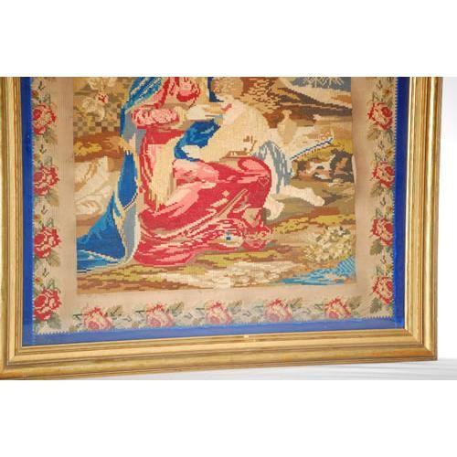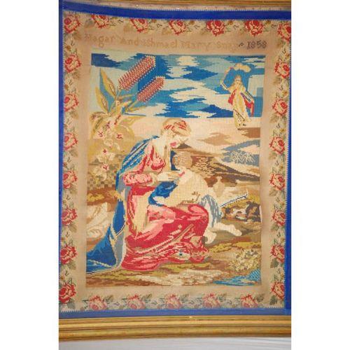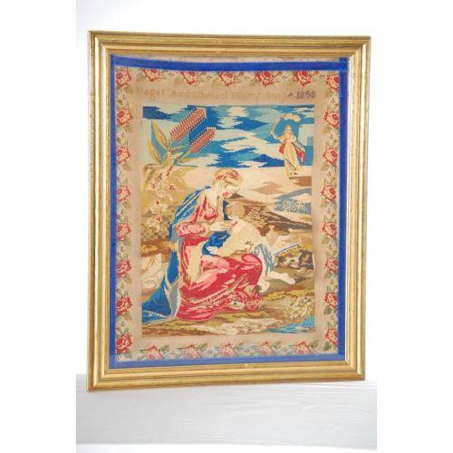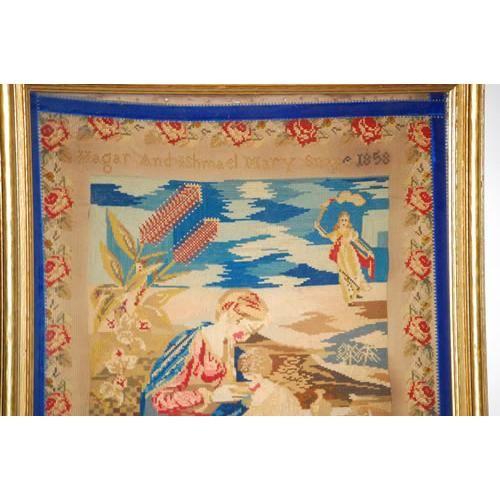 1858 GROSS NEEDLEPOINT EMBROIDERY OF HAGAR & ISHMAEL FROM GENESIS-WROUGHT BY MARY SNAPE & DATED 1858 IN POLYCHROME YARNS W/ FLORAL BORDER IN A GILT WOODEN FRAME (29 1/2" X 23 1/2") - WEAR, TONING, IMPERFECTIONS