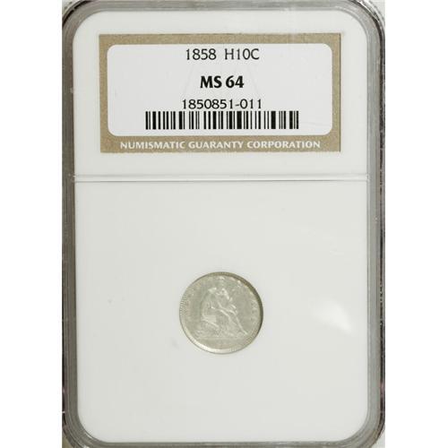 <B>1858 H10C MS64 NGC.</B></I> The luminous silver-gray surfaces host devices that are solidly struck in the centers, though the peripheral elements are slightly soft. A touch of rose toning appears in the date area. An attractive and desirable later example of the Stars variety.<BR><BR><b>Shipping:</b> Coins & Currency (<a target="_blank" href="http://www.heritageauctions.com/common/shipping.php">view shipping information</a>)