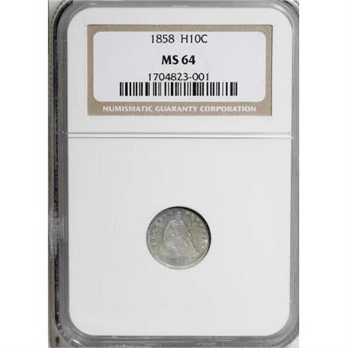<B>1858 H10C MS64 NGC.</B></I> NGC Census: (167/176). PCGS Population (113/134). Mintage: 3,500,000. Numismedia Wsl. Price for NGC/PCGS coin in MS64: $420. (#4367)<BR><BR><B>Coin Engraver:</B> Christian Gobrecht<BR><BR><b>Shipping:</b> Coins & Currency (<a target="_blank" href="http://www.heritageauctions.com/common/shipping.php">view shipping information</a>)
