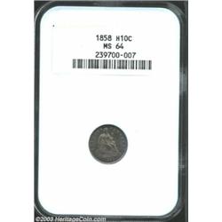 <TR><TD width="100%"><TABLE cellSpacing=1 cellPadding=3 width="100%" border=0><TBODY><TR><TD width="100%" bgColor=#79735c><FONT face=arial color=#ffffff size=3><B>Description</B> </FONT></TD></TR><TR><TD width="100%" bgColor=#ffffff><FONT face=arial size=2><B>1858 H10C MS64 NGC.</B></I> Slight central softness with nice steel-blue, steel-gray, gold, and violet toning. Both sides display some die clashing and close examination with a magnifying glass reveals light hairline scratches on Liberty's breast, torso, left (facing) leg, and the shield. </FONT></TD></TR></TBODY></TABLE></TD></TR></TBODY></TABLE><BR><A name=PricesRealized></A><TABLE cellSpacing=0 cellPadding=0 width="100%" bgColor=#000000 border=0><TBODY><TR><TD width="100%"><TABLE cellSpacing=1 cellPadding=3 width="100%" border=0><TBODY><TR><TD width="100%" bgColor=#79735c><A name=PR><FONT face=arial color=#ffffff size=3><B>Previous Prices from Heritage Auctions</B> </FONT></A></TD></TR><TR><TD bgColor=#f6f6ed><TABLE cellSpacing=0 cellPadding=0 width="100%" border=1><TBODY><TR><TD align=middle width="33%"><B>Date</B></TD><TD align=middle width="33%"><B>Service</B></TD><TD align=middle width="33%"><B>Price</B></TD></TR><TR bgColor=whitesmoke><TD width="33%"><B>04/11/1997</B></TD><TD width="33%">PCGS</TD><TD width="33%">$357.50</TD></TR><TR bgColor=whitesmoke><TD width="33%"><B>05/31/2003</B></TD><TD width="33%">PCGS</TD><TD width="33%">$603.75</TD></TR><TR bgColor=whitesmoke><TD width="33%"><B>08/05/2001</B></TD><TD width="33%">NGC</TD><TD width="33%">$333.50</TD></TR><TR bgColor=whitesmoke><TD width="33%"><B>09/25/1999</B></TD><TD width="33%">NGC</TD><TD width="33%">$333.50</TD></TR><TR bgColor=whitesmoke><TD width="33%"><B>11/12/1993</B></TD><TD width="33%">NGC</TD><TD width="33%">$379.50</TD></TR><TR bgColor=whitesmoke><TD width="33%"><B>12/03/1993</B></TD><TD width="33%">PCGS</TD><TD width="33%">$473.00</TD></TR><TR bgColor=whitesmoke><TD width="33%"><B>03/01/1997</B></TD><TD width="33%">ANACS</TD><TD width="33%">$1,155.00</TD></TR></TBODY></TABLE></TD></TR><TR><TD bgColor=#ffffff><FONT face=arial size=1 ?>PLEASE NOTE: All prices realized reflect the final hammer price PLUS the buyer's premium in auctions that charge a buyer's premium. Each item has a notation at the top of the listing indicating whether that lot included a buyer's premium. Example: A item that sells with a final hammer price of $100 and a 20% buyer's premium will display with a price realized of $120. All information listed is intended to be as accurate as possible, but errors are possible. Please use this guide carefully and inform us of any inaccuracies. </FONT></TD></TR></TBODY></TABLE></TD></TR></TBODY></TABLE><BR><TABLE cellSpacing=0 cellPadding=0 width="100%" bgColor=#000000 border=0><TBODY><TR><TD width="100%"><TABLE cellSpacing=1 cellPadding=3 width="100%" border=0><TBODY><TR><TD width="100%" bgColor=#79735c colSpan=6><FONT face=arial color=#ffffff size=3><B>Price Guide*</B> </FONT></TD></TR><TR bgColor=#f6f6ed><TD align=middle><B>Grade</B> </TD><TD align=middle><B>Coin World<BR>(Trends)</B> </TD><TD align=middle><B>Numismedia<BR>Retail</B> </TD><TD align=middle><B>Numismedia<BR>Wholesale</B> </TD><TD align=middle><B>Coin<BR>Universe</B> </TD><TD align=middle><B>Heritage<BR>Value Index</B> </TD></TR><TR bgColor=#ffffff><TD align=middle>63</TD><TD align=right>$225.00</TD><TD align=right>$270.00</TD><TD align=right>$225.00</TD><TD align=right>$270.00</TD><TD align=right>$177.00</TD></TR><TR style="FONT-WEIGHT: bold" bgColor=#cccfdd><TD align=middle>64</TD><TD align=right>$475.00</TD><TD align=right>$500.00</TD><TD align=right>$400.00</TD><TD align=right>$610.00</TD><TD align=right>$400.25</TD></TR><TR bgColor=#ffffff><TD align=middle>65</TD><TD align=right>$950.00</TD><TD align=right>---</TD><TD align=right>$800.00</TD><TD align=right>$1,250.00</TD><TD align=right>$769.38</TD></TR><TR bgColor=#ffffff><TD colSpan=6><FONT size=1>*All information listed is intended to be as accurate as possible, but errors are possible. No item may be returned or refused based on this information which is provided as a service to our customers. You should contact each pricing source directly to determine the accuracy of this information. </FONT></TD></TR></TBODY></TABLE></TD></TR></TBODY></TABLE><BR><TABLE cellSpacing=0 cellPadding=0 width="100%" bgColor=#000000 border=0><TBODY><TR><TD width="100%"><TABLE cellSpacing=1 cellPadding=3 width="100%" border=0><TBODY><TR><TD width="100%" bgColor=#79735c><FONT face=arial color=#ffffff size=3><B>Population Guide</B> </FONT></TD></TR><TR bgColor=#ffffff><TD align=middle><!-- Begin Output of Population Grid--><TABLE cellSpacing=0 cellPadding=0 width="100%" border=0><TBODY><TR><TD vAlign=center><TABLE cellSpacing=0 width="100%" border=1 cellsadding="3"><TBODY><TR><TD vAlign=center><TABLE cellSpacing=0 cellPadding=3 width="100%" border=1><TBODY><TR><TD vAlign=center align=middle bgColor=#f0f1e8 colSpan=2 <CENTER><FONT face=Arial size=2><B>PCGS Pop </B></FONT><CENTER></CENTER></TD><TD vAlign=center align=middle bgColor=#f0f1e8 colSpan=2><CENTER><FONT face=Arial size=2><B>NGC Pop</B></CENTER></FONT></TD></TR><TR><TD vAlign=center><FONT face=Arial size=2>(64)</FONT> </TD><TD vAlign=center align=right><FONT face=Arial size=2>111</FONT> </TD><TD vAlign=center><FONT face=Arial size=2>(64)</FONT> </TD><TD vAlign=center align=right><FONT face=Arial size=2>154</FONT> </TD></TR><TR><TD vAlign=center><FONT face=Arial size=2>(>64)</FONT> </TD><TD vAlign=center align=right><FONT face=Arial size=2>107</FONT> </TD><TD vAlign=center><FONT face=Arial size=2>(>64)</FONT> </TD><TD vAlign=center align=right><FONT face=Arial size=2>135</FONT> </TD></TR></TBODY></TABLE></TD></TR></TBODY></TABLE></TD></TR></TBODY></TABLE><!-- End Output of Population Grid--></TD></TR></TBODY></TABLE></TD></TR></TBODY></TABLE><BR><TABLE cellSpacing=0 cellPadding=0 width="100%" bgColor=#000000 border=0><TBODY><TR> Important notice: We expect to be auctioning lots at the rate o