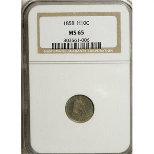 <B>1858 H10C MS65 NGC.</B></I> Deep rose-gray and cobalt-blue toning covers each side of this well struck Gem. The carefully preserved surfaces reveal satiny luster, and are nearly pristine.<BR><BR><b>Shipping:</b> Coins & Currency (<a target="_blank" href="http://www.heritageauctions.com/common/shipping.php">view shipping information</a>)