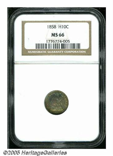 1858 H10C MS66 NGC. Aqua-green, gold, and lilac c