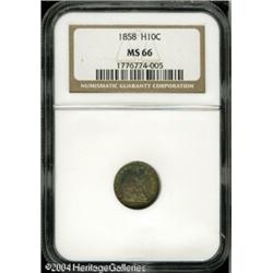 1858 H10C MS66 NGC. Aqua-green, gold, and lilac co <B>1858 H10C MS66 NGC.</B></I> Aqua-green, gold, and lilac colors compete for territory, with the reverse toning being deeper. Nicely struck, and well preserved surfaces. Population: 58 in 66, 21 finer (11/04). <BR><BR><B>Important notice:</B> Heritage usually auctions material at the rate of 200-250 lots per hour. On some occasions eBay Live bid software or the Internet may not be able to keep up with the pace of the auction. We recommend placing a realistic absentee bid now as insurance to avoid disappointment. Occasionally the auctioneer may eliminate or reject an eBay Live bid, and the auctioneer may also reopen a lot after the close of the eBay live bidding (usually because we missed an audience bid), and may reject your bid even if it shows you as the winning bidder. By bidding via eBay Live, you agree that Heritage may award the lot to another bidder at its sole discretion under the circumstances described above or any other reasonable circumstances. Since eBay bids are not shown to us until we open the lot on the floor, we treat those bids just like floor bids. In most cases the floor responds before the eBay bid is presented to us, due to Internet lag time, so for consistency we have made it a policy that floor bids are always considered first over tie eBay live bids. Also please note that all Heritage lots purchased through eBay Live carry a 20% Buyer's Premium. Please make sure you read the Terms and Conditions before you bid. This lot is being auctioned in conjunction with a live floor auction by Heritage Galleries & Auctioneers. All final auction and invoice information will be supplied by Heritage Galleries & Auctioneers, and all other information should be considered preliminary. Lot:5684