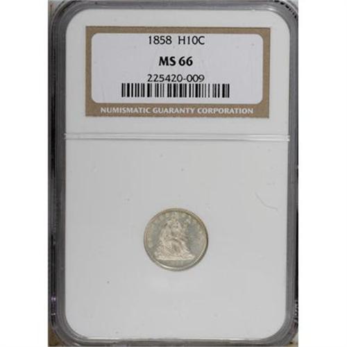 <B>1858 H10C MS66 NGC.</B></I> A brilliant, sharply struck, and moderately prooflike Premium Gem that is kept from a finer grade by a couple of faint handling marks in the right obverse field. Struck from clashed dies. Census: 55 in 66, 21 finer (6/07).<BR><BR><b>Shipping:</b> Coins & Currency (<a target="_blank" href="http://www.heritageauctions.com/common/shipping.php">view shipping information</a>)