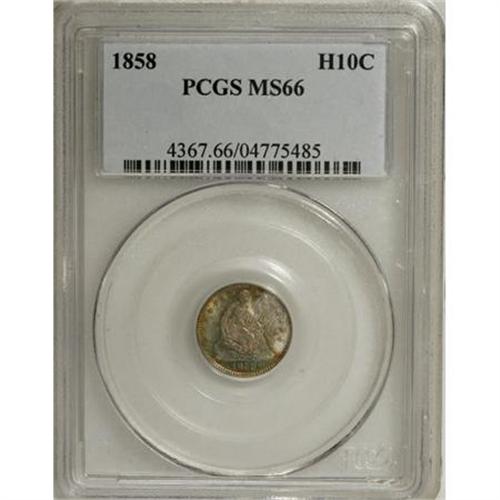 <B>1858 H10C MS66 PCGS.</B></I> A well struck example of this Stars on Obverse half dime issue, luminous beneath rich caramel-tan and blue-green toning over the obverse and olive and violet patina over the reverse. Carefully preserved and immensely appealing. Population: 39 in 66, 13 finer (8/07).<BR><BR><B>Coin Engraver:</B> Christian Gobrecht<BR><BR><b>Shipping:</b> Coins & Currency (<a target="_blank" href="http://www.heritageauctions.com/common/shipping.php">view shipping information</a>)