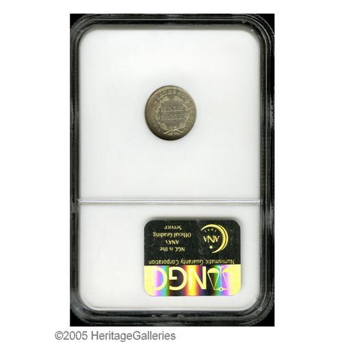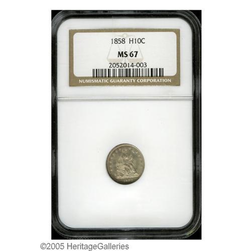 <B>1858<H10C> MS67 NGC.</B></I> Slight traces of champagne color are visible over frosty ivory surfaces. This is a splendid and Superb Gem with sharp design elements. The final 8 in the date is titled to the right, giving the entire date an outwardly curved appearance. Faint planchet striations are the only detractions on this beautiful coin. Population: 17 in 67, 3 finer (9/05).
