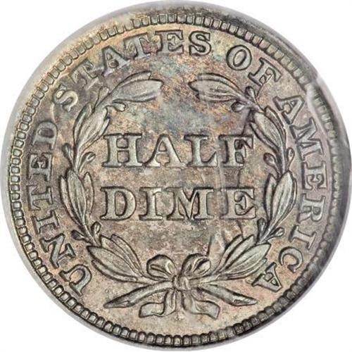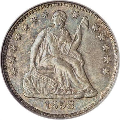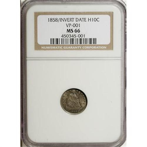 <B>1858 H10C Over Inverted Date MS66 NGC.</B></I> VP-001. Al Blythe, in his Seated Liberty half dime book, says of this issue that "All four digits of the date were originally punched upside down and then corrected. Tops of the inverted punched numerals can be seen slightly above the middle of the corrected date." Aqua-gray patina rests on the lustrous surfaces of this well preserved Premium Gem. Generally well struck. The finest certified specimen of either NGC or PCGS.<BR><BR><B>Coin Engraver:</B> Christian Gobrecht<BR><BR><b>Shipping:</b> Coins & Currency (<a target="_blank" href="http://www.heritageauctions.com/common/shipping.php">view shipping information</a>)