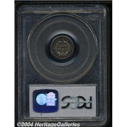 <B>1858<H10C> PR64 Cameo PCGS.</B></I> Proof Stars Obverse Half Dimes are a prized commodity among type collectors, but those possessing enough contrast to received a 'Cameo' designation are especially elusive. This Choice representative is modestly mirrored under a coating of speckled violet and sea-green toning. Population: 1 in 64 Cameo, 3 finer (4/04). <BR><BR><B>Important notice:</B> Heritage usually auctions material at the rate of 200-250 lots per hour. On some occasions eBay Live bid software or the Internet may not be able to keep up with the pace of the auction. We recommend placing a realistic absentee bid now as insurance to avoid disappointment. Occasionally the auctioneer may eliminate or reject an eBay Live bid, and the auctioneer may also reopen a lot after the close of the eBay live bidding (usually because we missed an audience bid), and may reject your bid even if it shows you as the winning bidder. By bidding via eBay Live, you agree that Heritage may award the lot to another bidder at its sole discretion under the circumstances described above or any other reasonable circumstances. Since eBay bids are not shown to us until we open the lot on the floor, we treat those bids just like floor bids. In most cases the floor responds before the eBay bid is presented to us, due to Internet lag time, so for consistency we have made it a policy that floor bids are always considered first over tie eBay live bids. Also please note that all Heritage lots purchased through eBay Live carry a 20% Buyer's Premium. Please make sure you read the Terms and Conditions before you bid.