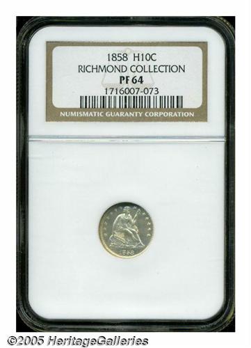 <B>1858<H10C> PR64 NGC.</B></I> Ex: Richmond Collection. Nearly brilliant with deep, watery reflectivity in the fields. A few hairlines limit the technical grade of this coin but do little to detract from its overall desirability. A film of light champagne-tan overlays each side, being just a touch heavier on the reverse. Nicely struck, with no significant marks.