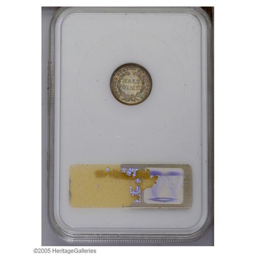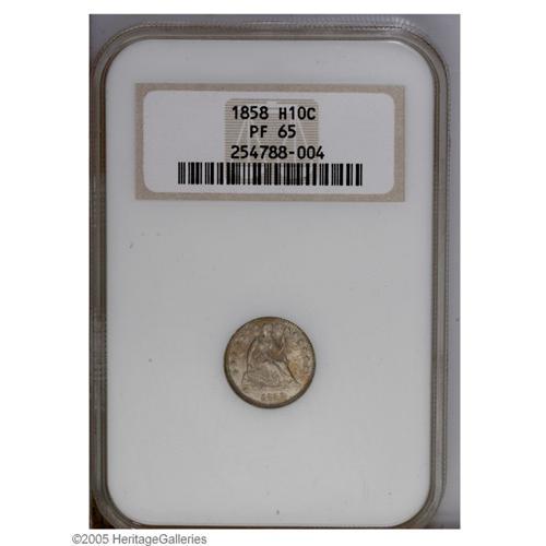 <B>1858<H10C> PR65 NGC.</B></I> Crisply struck with pleasing reflectivity in the fields, and attractive original toning that includes a mixture of terra cotta, sea-green, and golden coloration. A squiggly lint mark (as struck) rests on the upper reverse field, above the L in HALF, but the proof surfaces seem undisturbed by any post-striking anomalies. Only an estimated 80 proofs were produced in 1858, which was the first year that the Mint stepped up the number of proofs coined to meet the demand from the general collecting public. Population: 17 in 65, 13 finer (10/05).