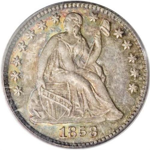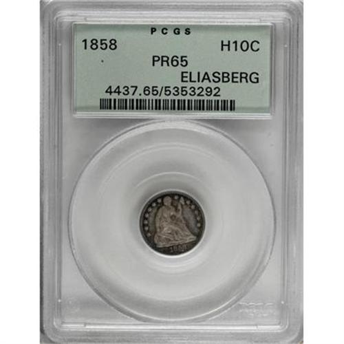<B>1858 H10C PR65 PCGS.</B></I> Ex: Eliasberg. Walter Breen in his 1988 <I>Encyclopedia</B></I> estimates 80 plus proof half dimes were minted in 1858, while Al Blythe, in his half dime reference book, suggests 40 to 50 proofs. In contrast to these estimates, the PCGS/NGC population data show about 130 certified examples (some of which are undoubtedly resubmissions). In any event, this exquisitely struck Gem displays strong field-device contrast when the coin is rotated under a light source. The frosty design elements are primarily grayish-mauve in color, and are further highlighted by iridescent cobalt-blue, lavender, and golden-tan in the fields. Nicely preserved throughout, and housed in a green-label holder. Population: 10 in 65, 2 finer (8/07).<BR><BR><B>Coin Engraver:</B> Christian Gobrecht<BR><BR><b>Shipping:</b> Coins & Currency (<a target="_blank" href="http://www.heritageauctions.com/common/shipping.php">view shipping information</a>)