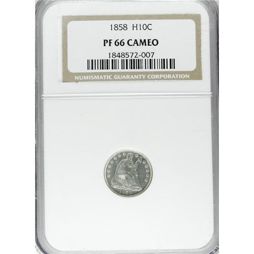 <B>1858 H10C PR66 Cameo PCGS.</B></I> It has been three years since we offered a Cameo example of the 1858. As a date, the 1858 is desirable as a With Stars type coin and it is generally only available in this and the next year. This splendid example is brilliant throughout. The fields are deeply reflective and there is a generous amount of mint frost over the devices which yields a strong cameo contrast. The only mentionable disturbance in the mirrored fields is the presence of a squiggly lint mark on the right side of the obverse. One of only two coins so graded by NGC, none are finer (4/07).<BR><BR><b>Shipping:</b> Coins & Currency (<a target="_blank" href="http://www.heritageauctions.com/common/shipping.php">view shipping information</a>)