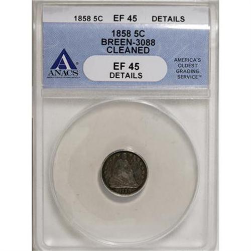 <B>1858 H10C --Cleaned--ANACS XF45 Details.</B></I> Breen-3088. NGC Census: (4/573). PCGS Population (6/472). Mintage: 3,500,000. Numismedia Wsl. Price for NGC/PCGS coin in XF45: $57. (#4367)<BR><I>From The Al Blythe Collection of Half Dimes.</B></I><BR><BR><B>Coin Engraver:</B> Christian Gobrecht<BR><BR><b>Shipping:</b> Coins & Currency (<a target="_blank" href="http://www.heritageauctions.com/common/shipping.php">view shipping information</a>)