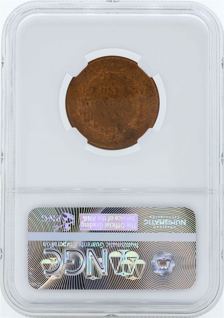One 1858 India 1/4 Anna Coin Single Leaf NGC MS64RB. NGC Certified.